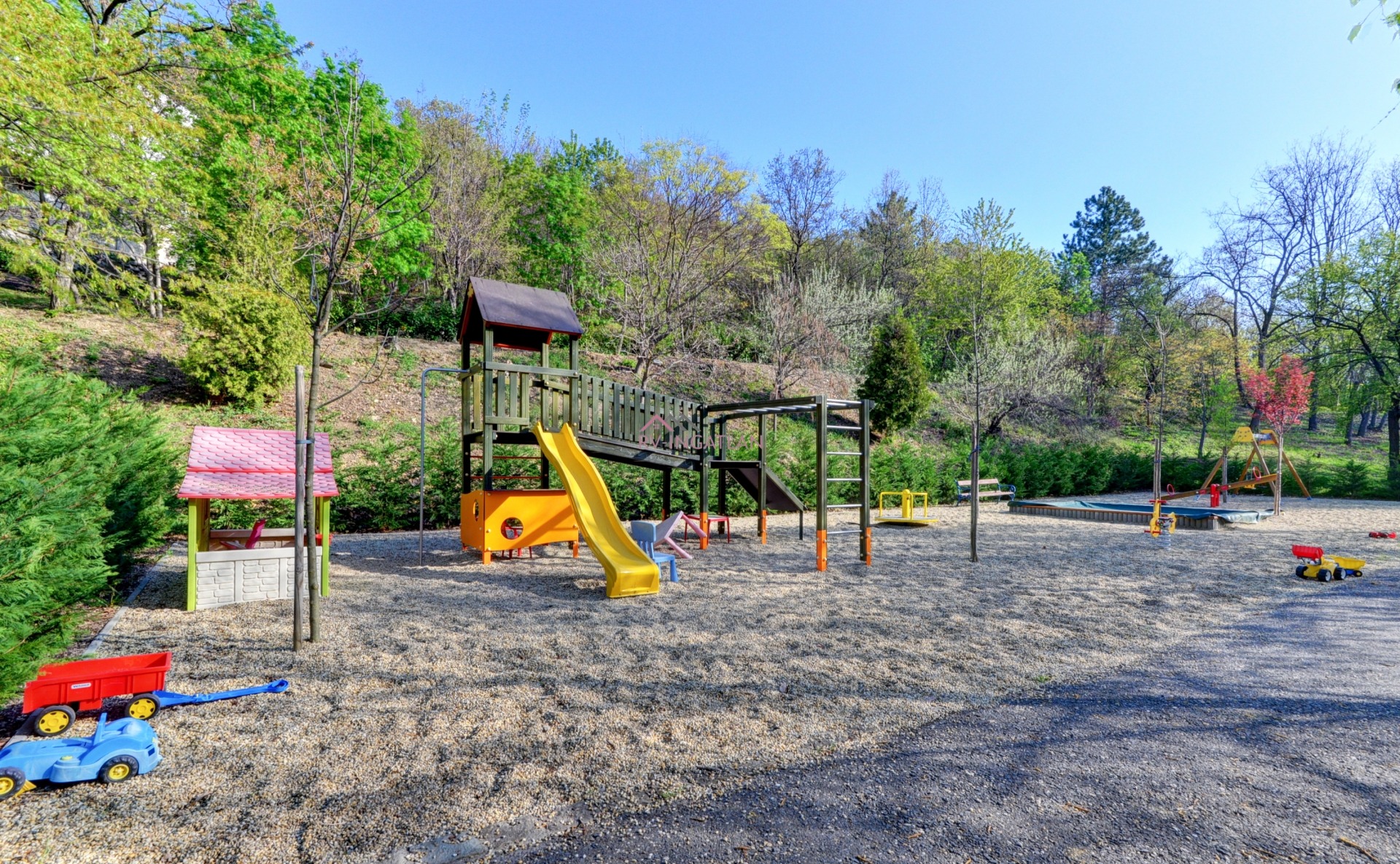 Extrák: panorámás kilátás a Hármashatár-hegyre, fan-coil hűtés/fűtés, riasztórendszer, 24 órás portaszolgálat, hatalmas gondozott kert veszi körül, játszótér, kerti tó és grillezőhely a lakóparkon belül.
